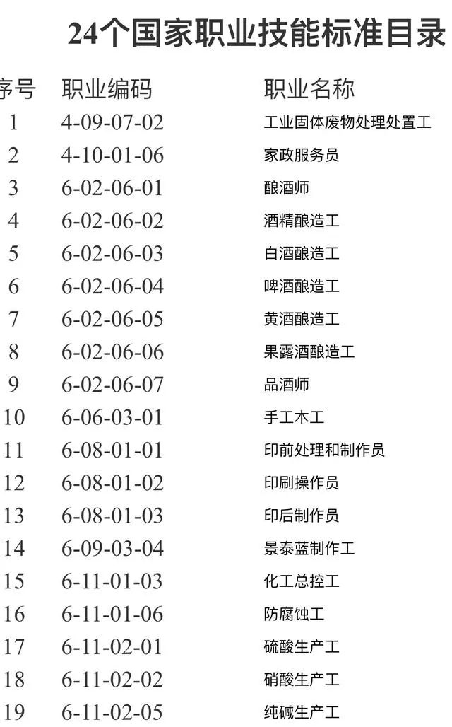 近日,人力资源和社会保障部颁布了家政服务员等24个国家职业技能标准。此次颁布标准的24个职业,涵盖了《中华人民共和国职业分类大典(2015年版)》中第四大类“社会生产服务和生活服务人员”的环保、居民服务领域,以及第六大类“生产制造及有关人员”的化工、工美、轻工、印刷、建筑等领域。